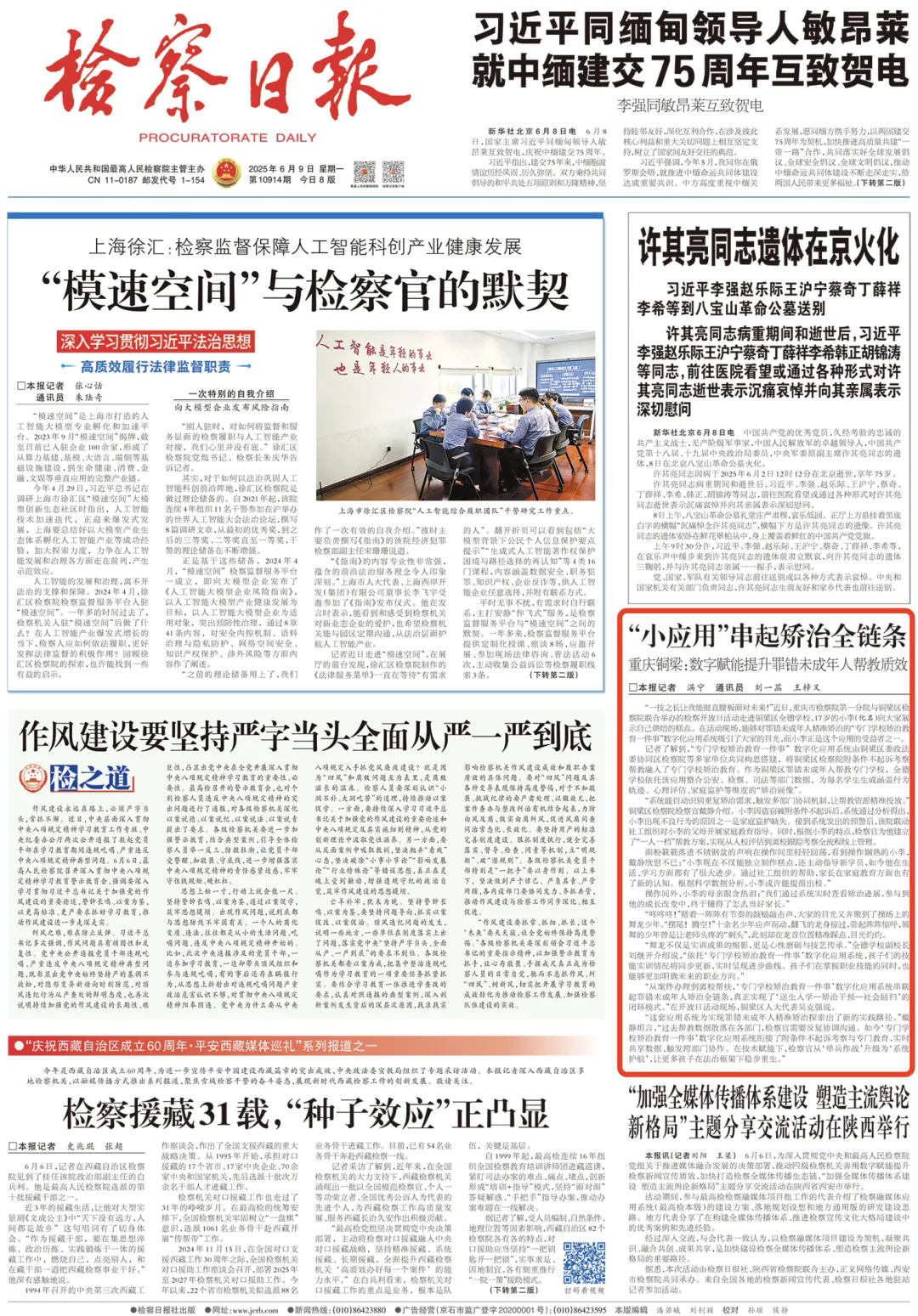 2025年6月9日,《检察日报》头版刊登《“小应用”串起矫治全链条——重庆铜梁:数字赋能提升罪错未成年人帮教质效》一文,内容如下: