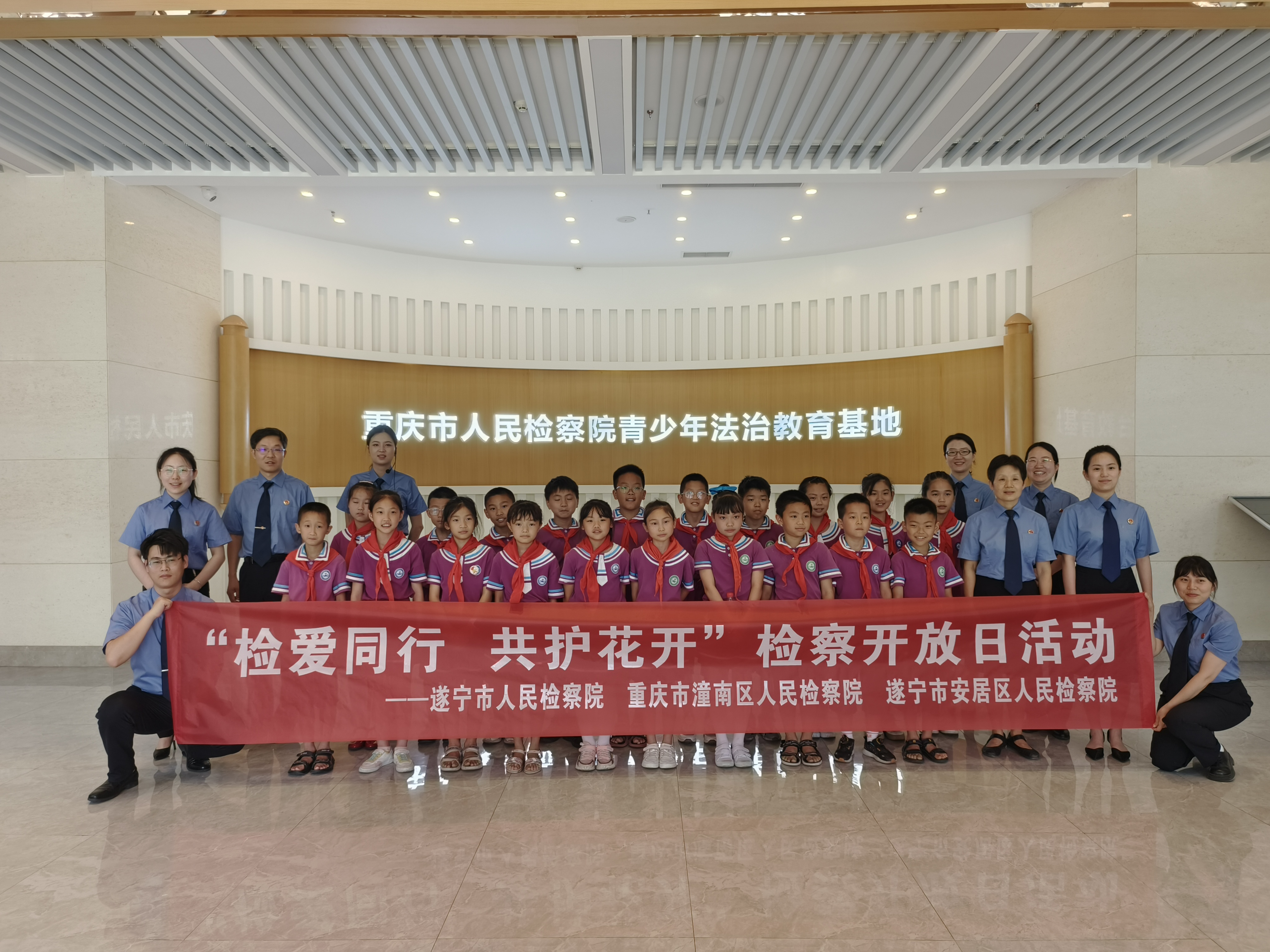 5月30日,重庆市潼南区检察院携手遂宁市检察院,跨区域共同举办“检爱同行,共护花开”未成年人保护主题检察开放日活动。来自遂潼两地的20名留守儿童在检察官的带领下,先后来到了重庆市检察院青少年法治教育基地、遂宁市安居区未成年人保护中心,畅游法治基地、体验模拟法庭,留下了独特又珍贵的儿童节回忆。