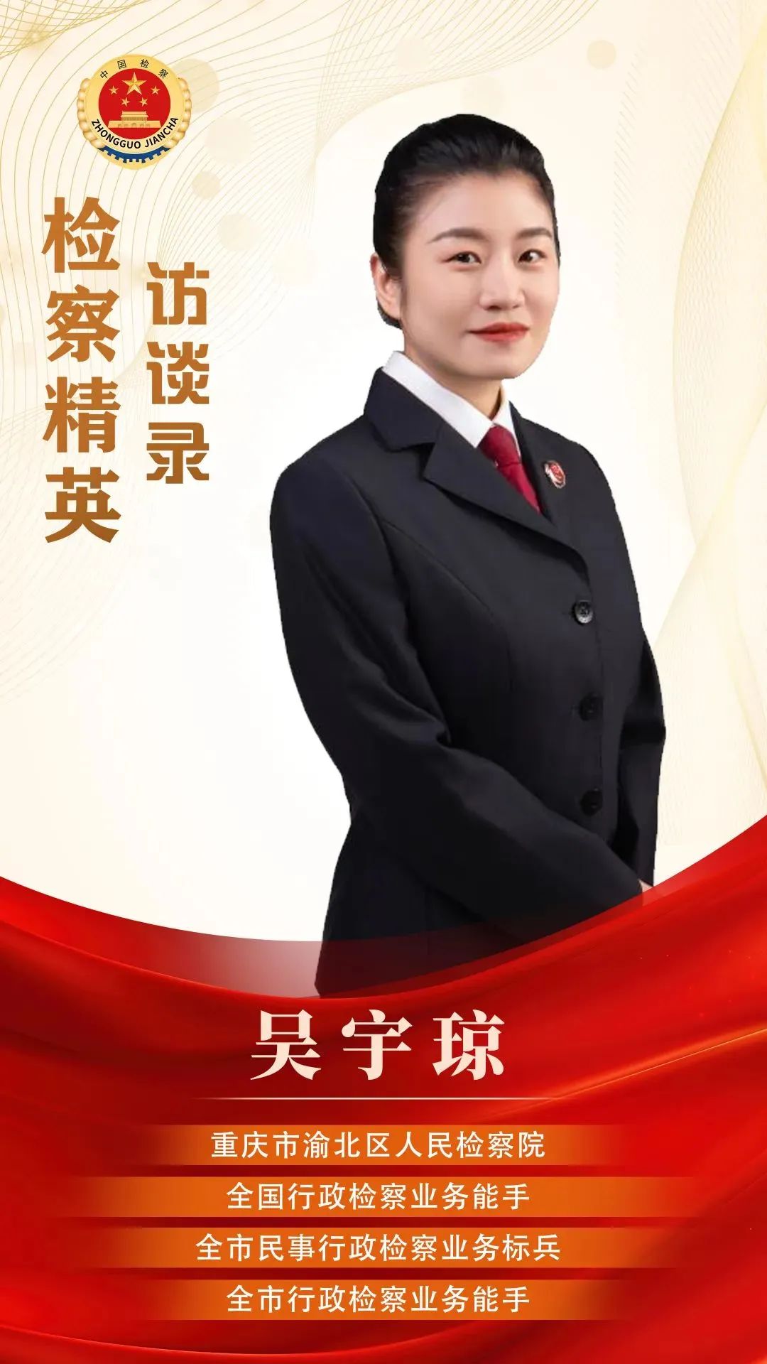 吴宇琼,女,1984年9月出生,2005年5月加入中国共产党,现为重庆市渝北区人民检察院检察三部检察官。曾荣获全国行政检察业务能手、全市民事行政检察业务标兵、全市行政检察业务能手称号,入选全市行政非诉执行专业团队。
