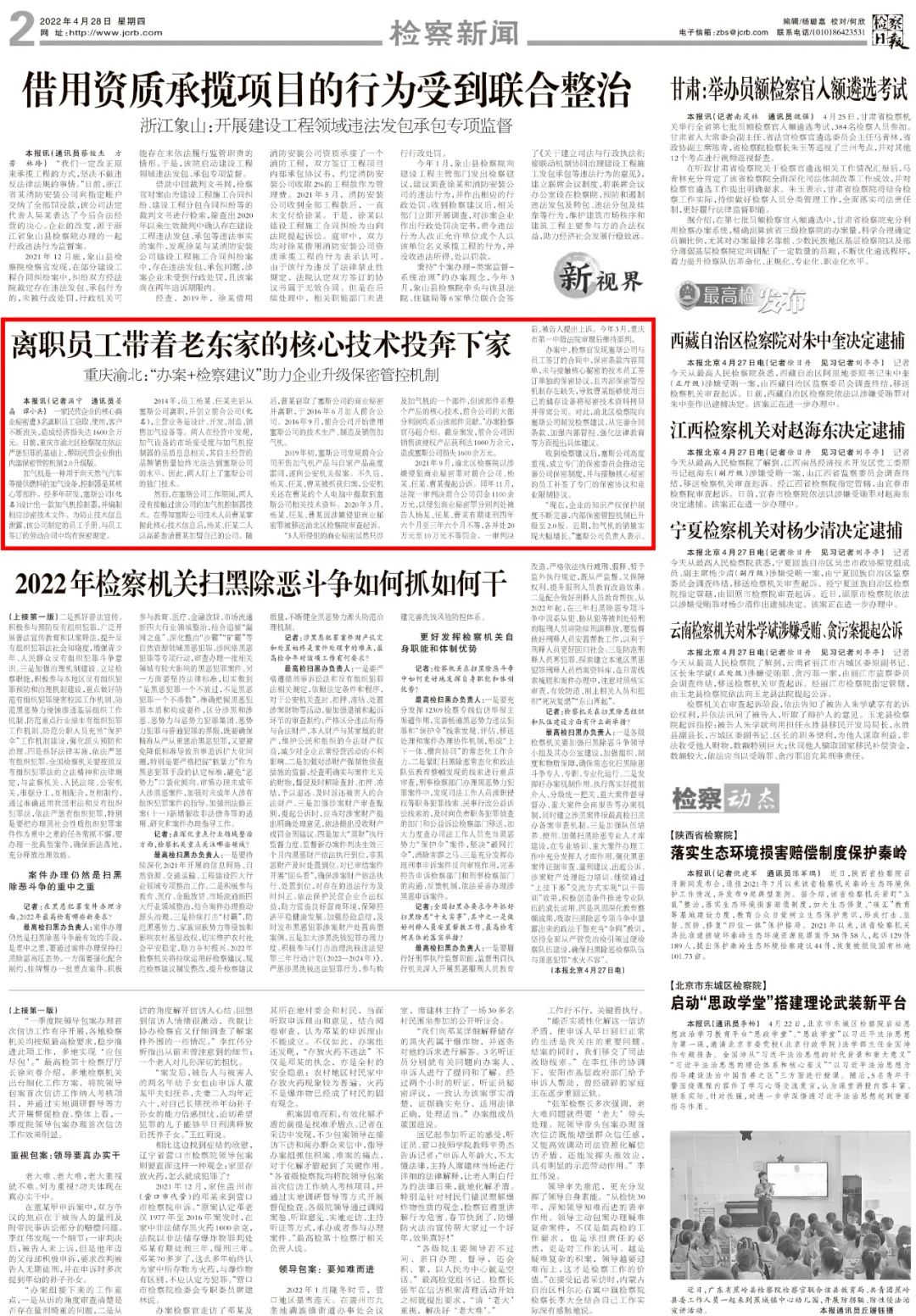 2022年4月28日,《检察日报》第2版刊登《离职员工带着老东家的核心技术投奔下家——重庆渝北:“办案+检察建议”助力企业升级保密管控机制》一文,内容如下:
