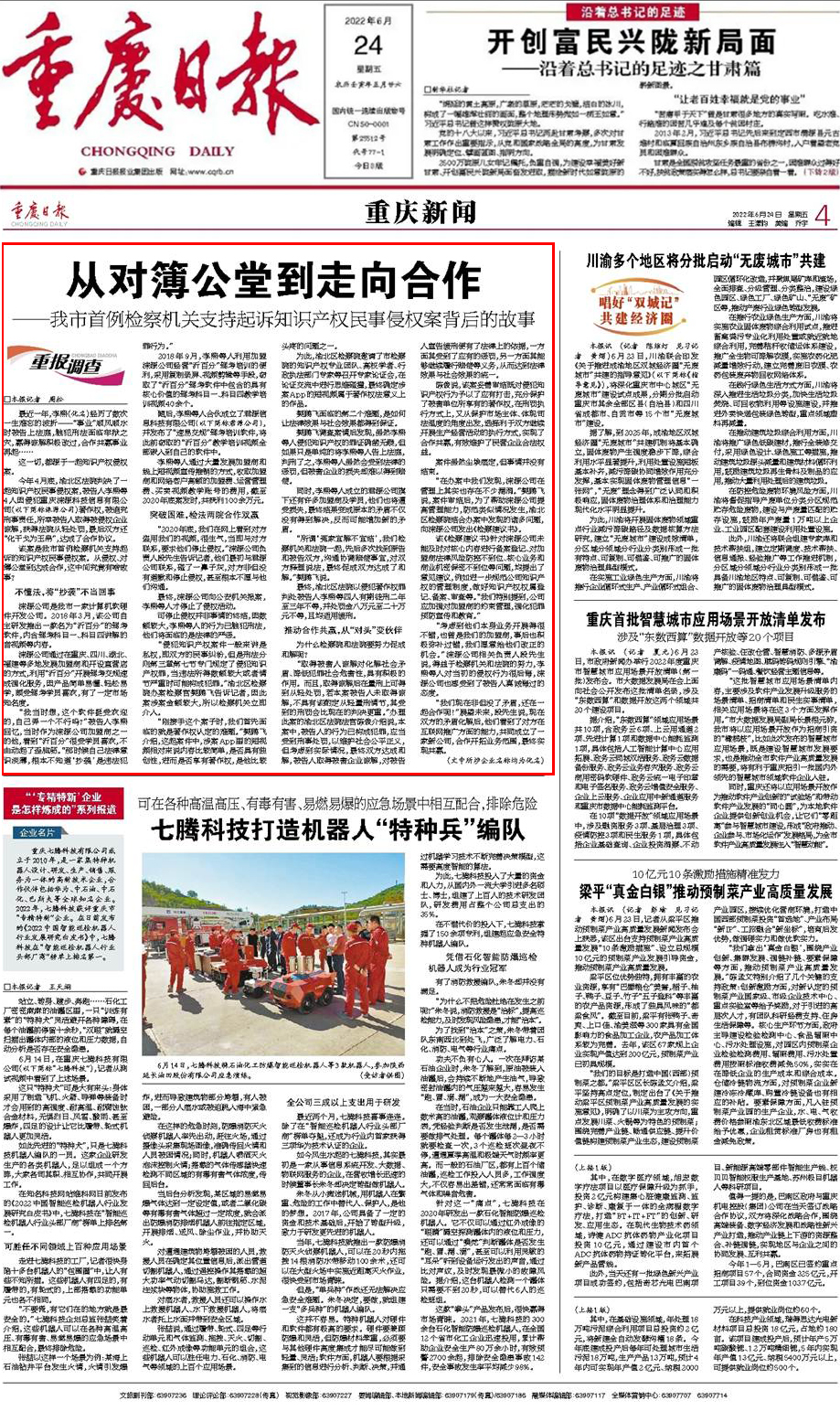 2022年6月24日,《重庆日报》第4版“重报调查”专栏刊登《从对簿公堂到走向合作——我市首例检察机关支持起诉知识产权民事侵权案背后的故事》一文,内容如下: