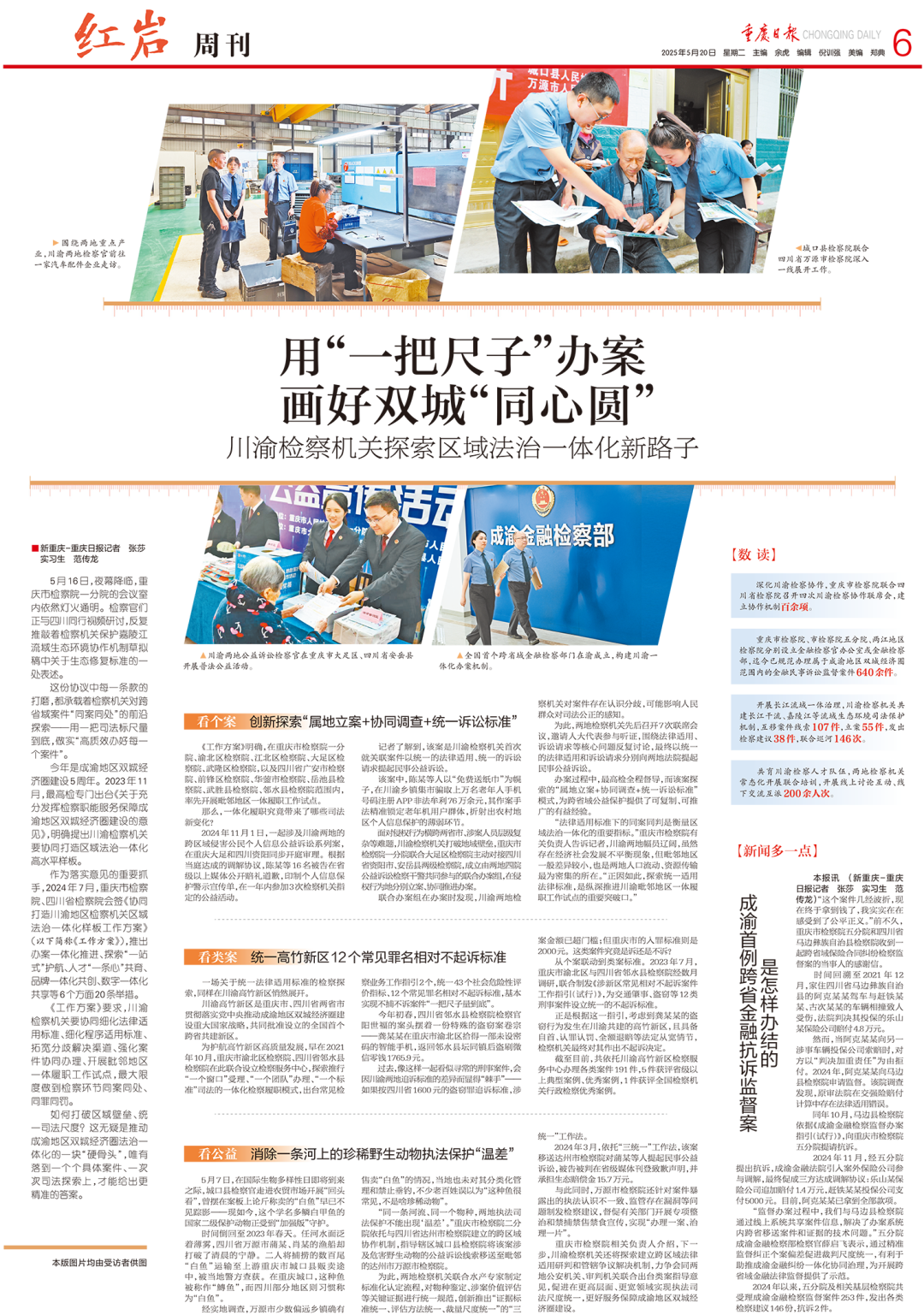 2025年5月20日,《重庆日报》第6版 “红岩周刊”整版刊登《用“一把尺子”办案 画好双城“同心圆”——川渝检察机关探索区域法治一体化新路子》一文,内容如下: