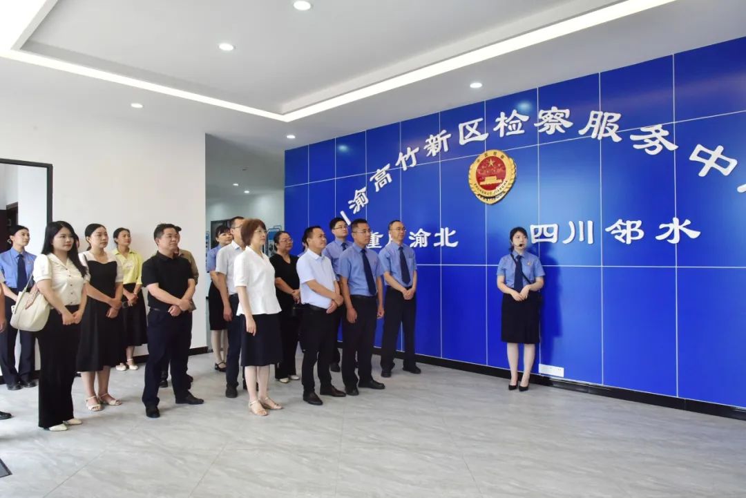 在与会人员的见证下,邻水县检察院党组书记、检察长姚学文,渝北区检察院检委会专职委员张广超,渝北区委社会工作部基层治理科科长陈振南,邻水县委社会工作部部长甘友权共同为川渝高竹新区“未成年人检察社会工作站”揭牌。