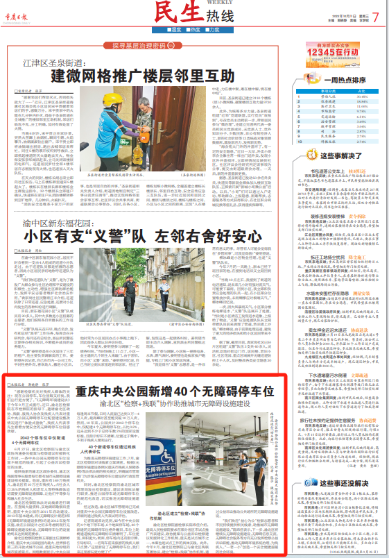 2023年10月11日,《重庆日报》第7版“民生热线”刊登《重庆中央公园新增40个无障碍停车位——渝北区“检察+残联”协作助推城市无障碍设施建设》一文,内容如下: