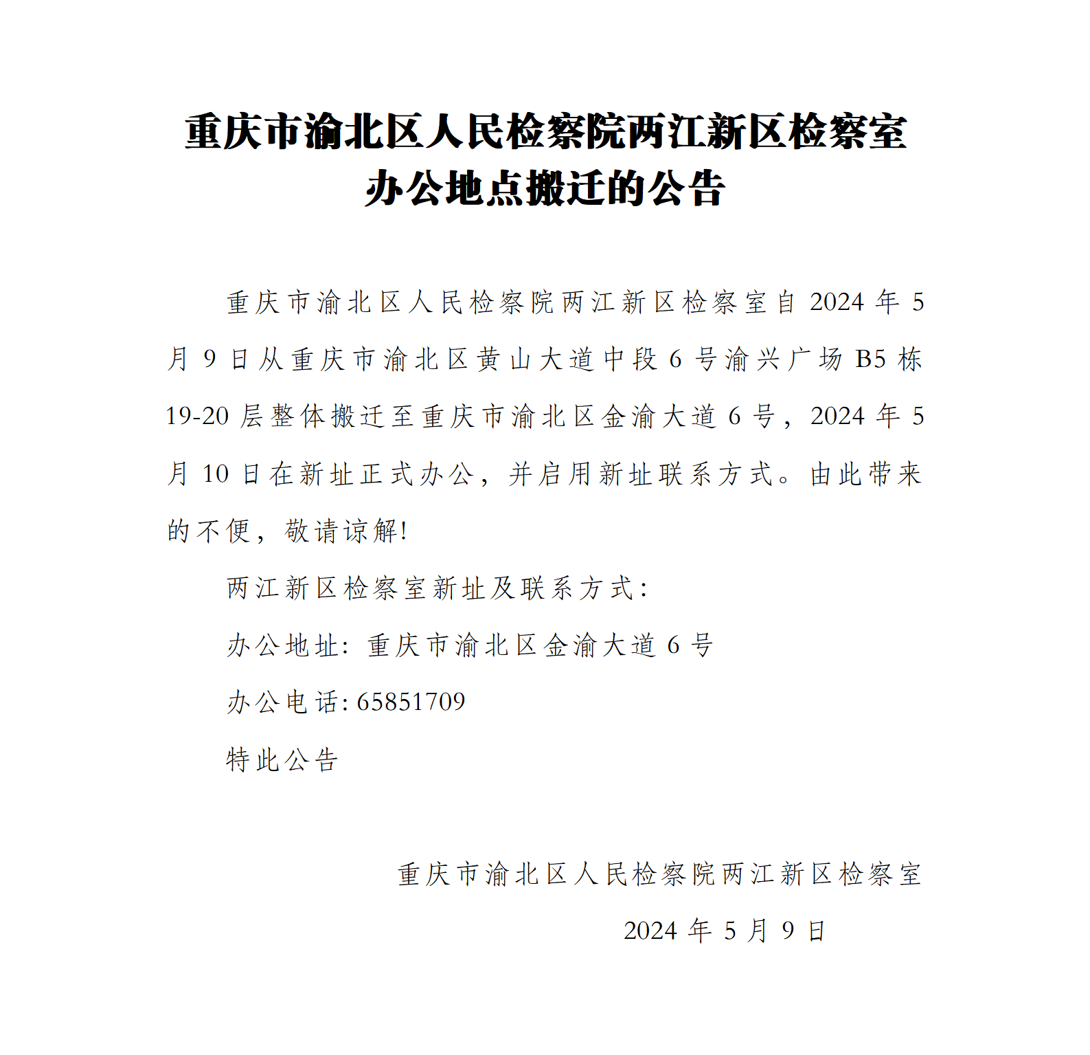 重庆市渝北区人民检察院两江新区检察室办公地点搬迁的公告