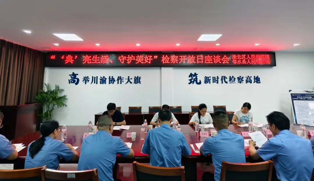 5月22日,渝北区检察院联合四川省邻水县检察院在川渝高竹新区检察服务中心,组织开展“‘典’亮生活,守护美好”检察开放日活动,邀请两地人大代表、政协委员参观并交流座谈。